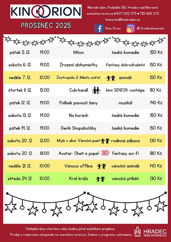 V sobotu 20. 12. 2025 probíhá na Podolské ulici tradiční vánoční jarmark.Ve 12 hodin můžete přijít do kina Orion na rodinný film Myši v akci: Vánoční past.